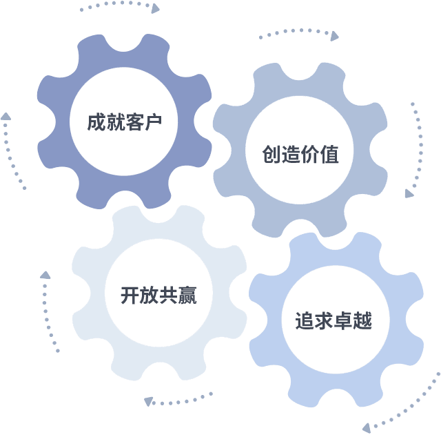 成就客户是一切决策的出发点,,,,创造价值是衡量所有工作的标准,,,,追求卓越是我们做事做人的态度,,,开放共赢是我们的格局也是最终的结果。。。价值观的齿轮环环相扣,,,推动着组织里的每个人不断向前。。。。