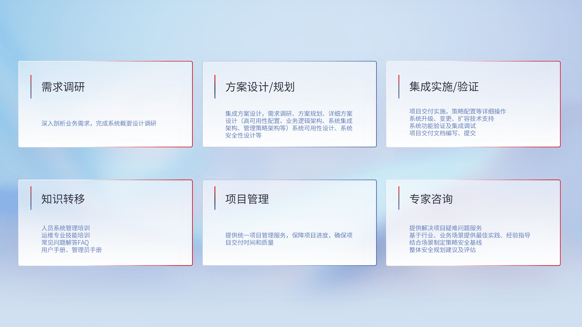 针对客户行业特性,,,,将宏观的安全战略和需求,,通过专业的交付服务,,,实现项目落地,,,为客户提供标准规范的集成交付服务。。。